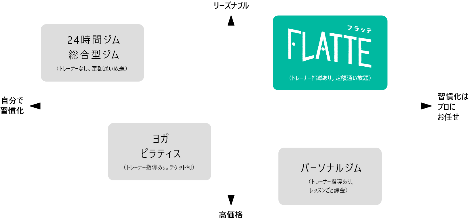 FLATTEでは、トレーニングにプロが寄り添います。お客様の目的や生活リズムに合わせたレッスンメニューを提示、LINEでも相談に乗りながら運動習慣をサポートします。さらに、毎日通い放題で定額制。「運動したいけど1人では続かない」「リーズナブルな金額で運動習慣をつくりたい」といった方におすすめのジムです。